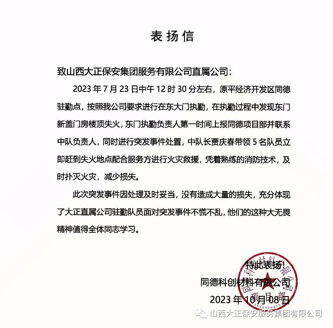 2023年10月8日,山西大正保安服務(wù)集團(tuán)有限公司收到一封來(lái)自原平經(jīng)開(kāi)區(qū)同德科創(chuàng)材料有限公司的表?yè)P(yáng)信,對(duì)原平經(jīng)開(kāi)區(qū)同德對(duì)駐勤點(diǎn)全體隊(duì)員的工作提出表?yè)P(yáng)。