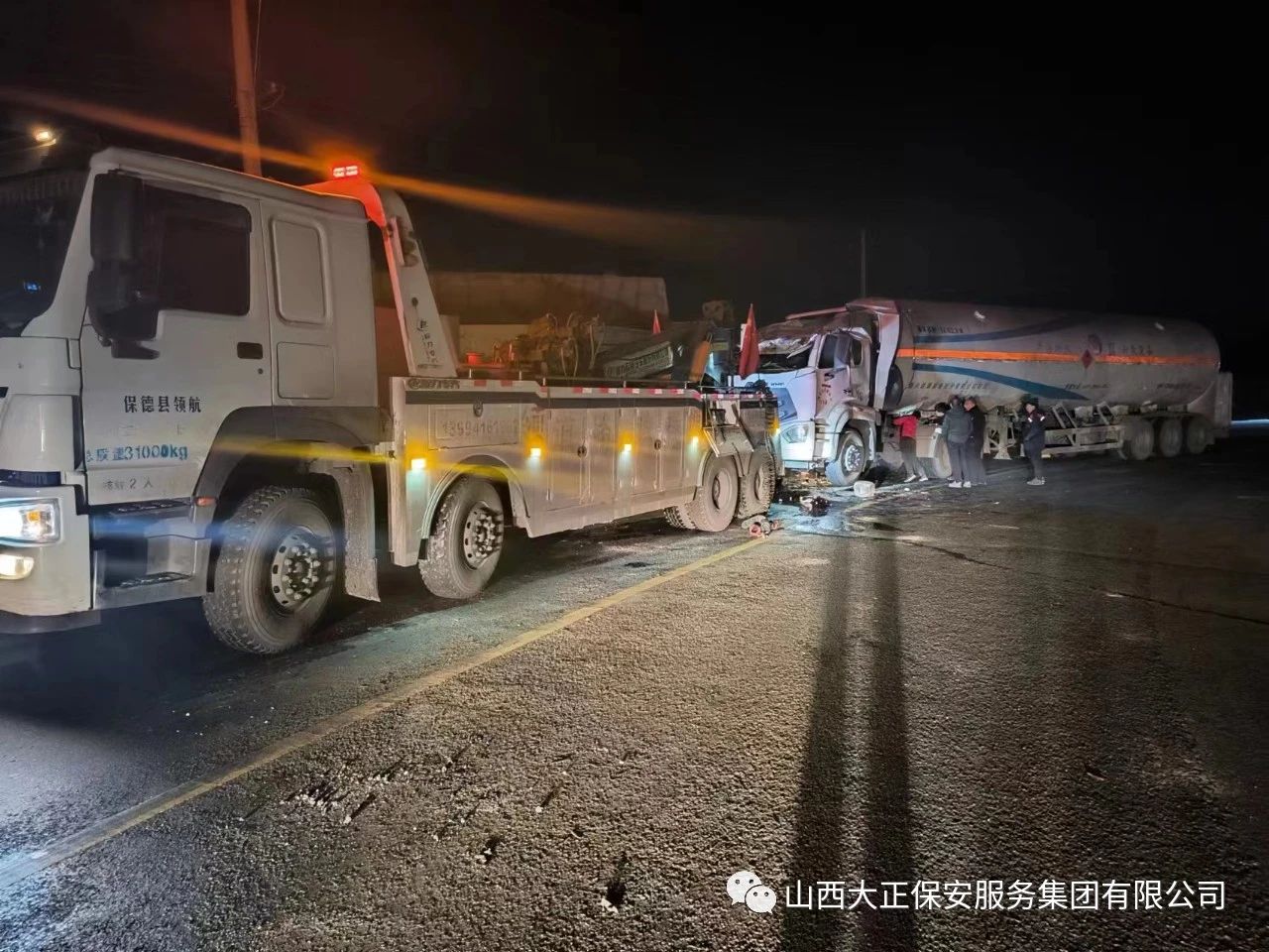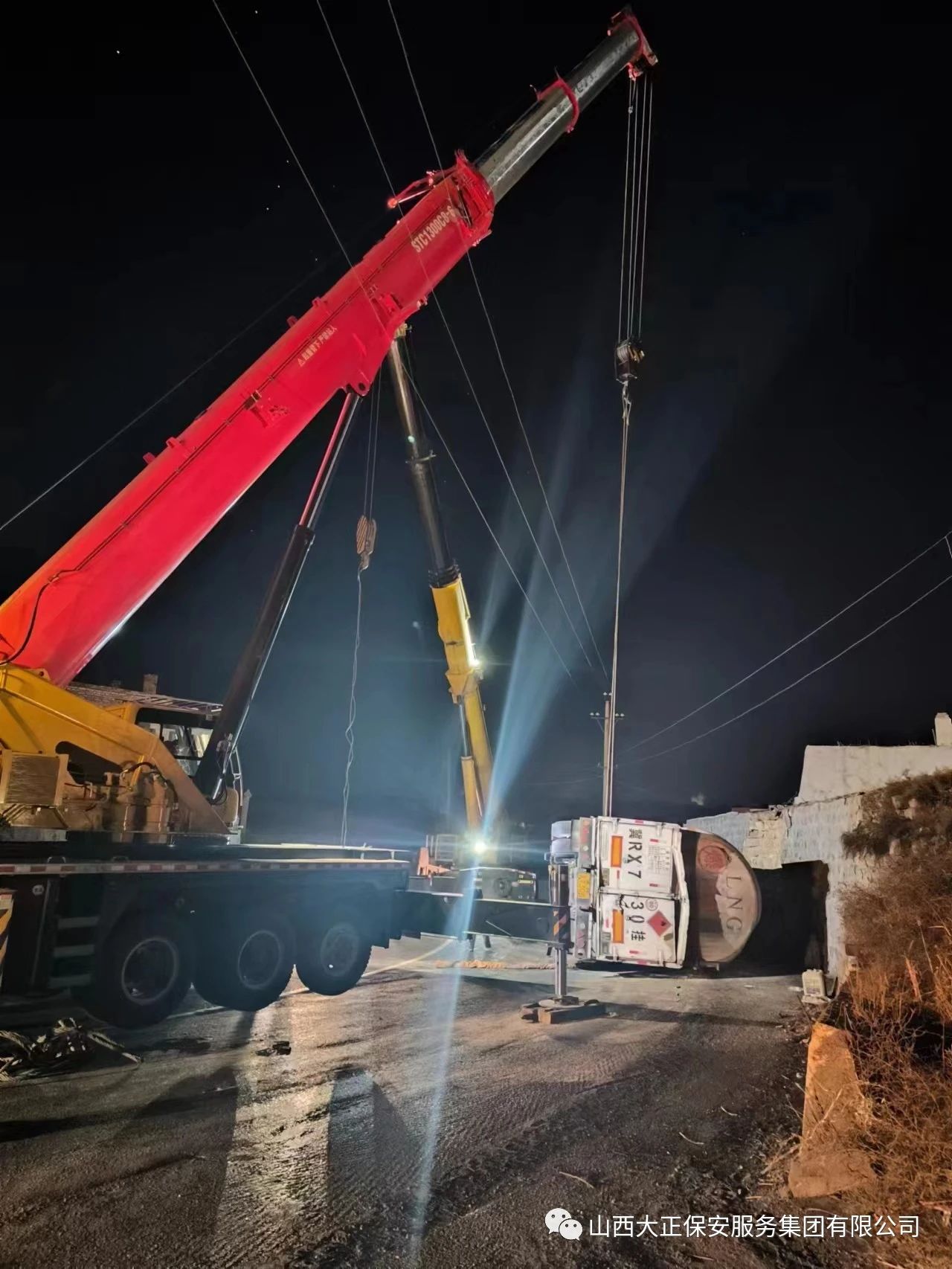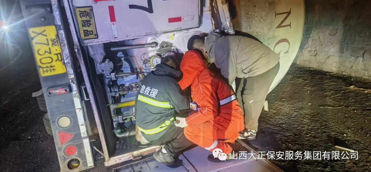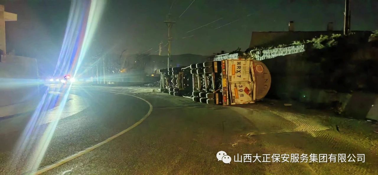 2023年11月23日晚8時(shí),山西大正保安集團(tuán)公司保德縣守押中隊(duì)?wèi)?yīng)急救援大隊(duì)接到應(yīng)急局出勤指令,棗林坡有滿載液化氣罐車發(fā)生側(cè)翻,需要派出應(yīng)急人員控制現(xiàn)場,并協(xié)助處理側(cè)翻事故。應(yīng)急救援大隊(duì)接到命令后,派出應(yīng)急車輛兩部及應(yīng)急人員5人趕赴現(xiàn)場,協(xié)助交警對現(xiàn)場路段進(jìn)行管控,保證周圍車輛人員安全。